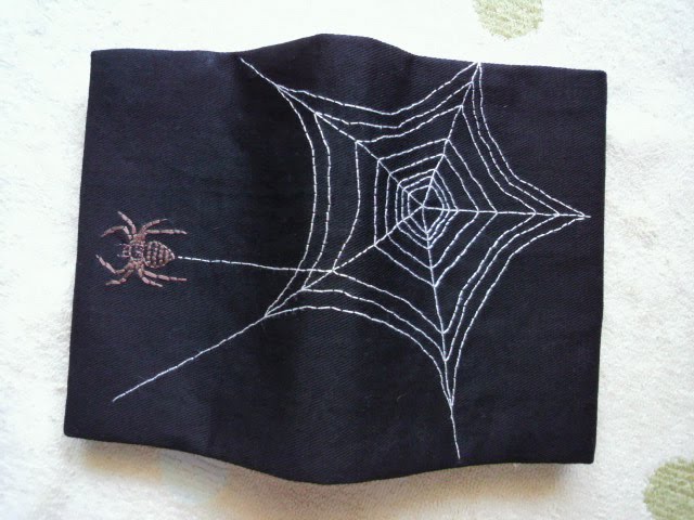 怖ーい!!クモの刺繍のブックカバーです。娘がドクロ柄の布でブックカバーが欲しいと言っていたのですが、、ドクロはな〜、、、、縁起悪い感じだな〜って クモの巣とクモにしてみましたが、、、嫌な夢を見そうです。
