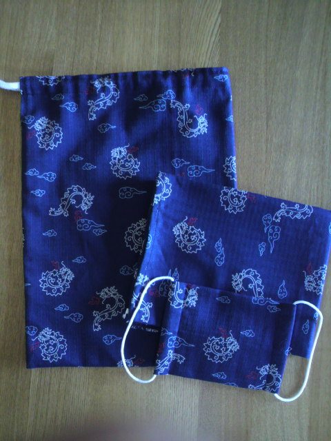 茶色 珍しく 男の子っぽい柄の☆給食セット☆を作りました。