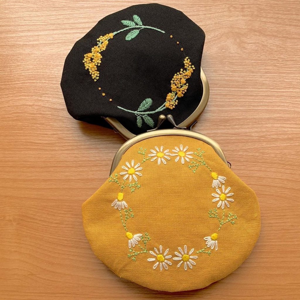 完売しておりました、黄色生地にカモミール刺繍のがま口ポーチ、再販スタートしております。